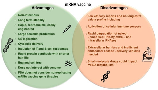 In recent years, there has been a great deal of focus on the use of mRNA, with advances leading to the development of vaccines, cancer immunotherapies, protein therapy alternatives, and genetic therapies [,,,]. Some of the advantages and disadvantages of mRNA vaccines are mentioned in Figure 2. These vaccines have many advantages over plasmid DNA (pDNA) and vaccines based on viral vectors. Notably, these vaccines do not integrate into the genome of host cells and do not alter the genome, and since recombination between single-stranded RNA is rare, cytosolic mRNA has no interaction with the genome. It can retain the properties of DNA vaccines and is very effective and clinically safe. They are delivered for on-site antigen expression without the need to cross the nuclear membrane barrier for protein expression, and can express complex antigens without packaging restrictions, so they are readily available [,,,,,,,]. As discussed, one of the main advantages of mRNA vaccines is the speed at which they can be produced. The synthesis and purification of mRNA is faster, easier, and less expensive than other vaccines []. All these factors combine to give mRNA vaccines a significant advantage in the rapid response to new epidemics and pandemics.