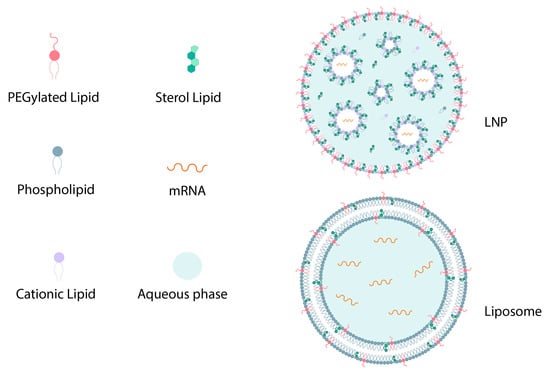 Nanoplatforms that can be used to deliver mRNA in the body include polymer-based nanoparticles, polymer–lipid hybrid nanoparticles, polypeptides, protein derivatives, complexes of protein mRNA derivatives, and gold nanoparticles. All of these have the relative ease of large-scale production, scaling their manufacturing ability, to provide the ability to deliver enclosed mRNA delivery to ribosome mRNA (via endosome escape), and flexibility is used to modify the surface with a ligand to further target specific cells [,]. Lipids are the best choice for mRNA transfer due to their fusion compatibility with lipid cell membranes []. Some advancements in lipid nanoparticles are listed in Figure 3. First, to identify lipids, it must be noted that these are amphiphilic molecules that consist of a hydrophobic tail region, a polar head group, and a linker between the two groups []. LNPs are stable, biocompatible particles with a bilayer lipid shell consisting of four components: cationic/ionizable lipids, PEG, auxiliary lipids, and cholesterol, that encompass an aqueous core in which they can carry mRNA to protect it from destruction (Figure 4) [,,]. The ratio of these components varies based on the target tissue, and are differentiated from liposomes due to the lack of a hollow nucleus []. It can be noted that the function of liposomes in drug delivery is absorption. Liposomes are also spherical lipid vesicles but have two concentric lipid layers and reach one or more layers that are confined to a water space (Figure 4). Liposomes have the ability to carry hydrophobic and hydrophilic molecules. Cationic liposomes, which are mainly composed of cationic lipids, can effectively concentrate nucleic acids due to positive charges [,]. The comparison between liposomes and LNPs is shown in Table 1. The use of liposomes in mRNA delivery can have the advantage that they can protect mRNA against nucleases, they have high transfer efficiencies, and because of their resemblance to cell membranes, they can easily combine with receptor cells. As they are not host constrained, they can simulate cell membranes to achieve long-term storage stability []. However, the downside of liposomes is that, because of their low encapsulation efficiency of oligonucleotides, they cannot be used for the in vivo development and delivery of nucleic acid vaccines []. The selection of LNPs for mRNA vaccine delivery has changed from the past, from lipoplexes, cationic nanoemulsions, and traditional liposomes to more advanced solid nanoparticles and nanostructured lipid carriers [,].