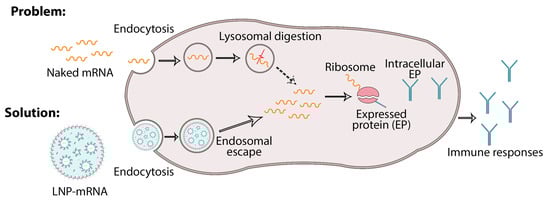 The development of nanoparticles in recent decades has led to their use to overcome biological barriers from systemic to cellular levels and to reduce the limitations of free drug molecules. Nanoparticles improve the solubility of drugs, aid in treatment escape from the immune system, and increase the half-life of drugs in the circulatory system. In addition, nanoparticles can deliver drug compounds to work together in the target cell and program to accurately absorb specific drugs, as well as releasing them into the target cell []. mRNA has a general negative charge, its molecular size is large, and it is hydrophilic. On the other hand, the cell membrane is lipid-friendly and negatively charged, so mRNA tries to pass through it through diffusion. As this mRNA is foreign, it is recognized by the host as foreign matter, so ribonucleases (RNases) cleave it into small nucleotide fragments. This cleavage causes only a small amount of mRNA to pass through the membrane subdomain. It is rich in lipid rafts that attach to the inner cell membrane, resulting in the accumulation of lysosomes, where most mRNA is decomposed. Nanotechnology and the use of nanoparticles have solved some problems of intracellular delivery of mRNA and offer protection from these processes [,].