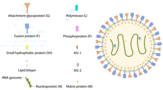 Respiratory syncytial virus (RSV), with two subgroup, RSV A and RSV B, is the major cause of lower respiratory tract illness in infants of six months of age and less. Infants exposed to RSV in their respiratory system are at high risk of contracting the infection in childhood and adulthood, and current infections are at their highest-ever recorded rates. The significant side effects of RSV include respiratory distress, pneumonia, and bronchiolitis, which can be fatal. To date, there are no candidate vaccines approved for use in clinical applications [,]. RSV genome structure includes ten genes that express eleven proteins. RSV fusion F protein and glycoprotein G were discovered as the major antigens expressed, and the consequential target of neutralizing and protective antibodies (Figure 10). Recent studies describe a mechanism in which the humoral responses to natural RSV effects focus on targeting the prefusion complex [].
