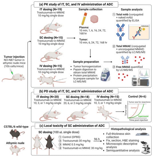 An overview of the experimental design. (a) PK study following IT, SC, and IV administration of 10 mg/kg T-vc-MMAE in NCI-N87 tumor-bearing nude mice; (b) efficacy study of IT, SC, and IV administered T-vc-MMAE (high, mid, and low doses) in NCI-N87 tumor-bearing nude mice; (c) local toxicity study of SC administered T-vc-MMAE, naked mAb (trastuzumab), naked payload (MMAE), and vehicle control in wild-type and nude mice.