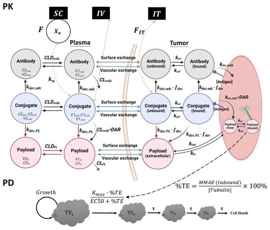 Schematic diagram of the semi-mechanistic PK/PD model developed for IV, IT, and SC administered T-vc-MMAE ADC. The PK model consists of the plasma and tumor PK models connected via vascular (extravasation) and surface exchange (diffusion). The PK model is connected to the PD model using intracellular target engagement (%TE) predicted by the PK model, which is used to drive the efficacy of T-vc-MMAE. Please refer to the PK and PD model structure sections in the method section for a detailed description of the symbols and disposition processes captured by the model.