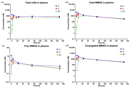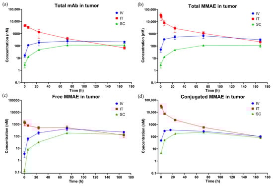 From the PK/PD perspective, SC and IT routes can potentially improve the therapeutic index of ADCs. SC administration leads to slower absorption of the drug from the site of administration, which results in lower maximum concentration () and comparable area under the plasma concentration–time curve (AUC) for the drugs when compared to IV administration []. Therefore, SC-administered ADCs may have improved tolerability without compromising the efficacy, if one assumes that drives the toxicity and AUC drives the efficacy. Moreover, assuming drug exposure within the tumor drives the efficacy [], IT administration of ADCs can significantly increase tumor exposure and enhance the efficacy of ADCs. To objectively evaluate these assumptions, here we investigated the PK and PD of an ADC in mice following IV, SC, and IT administration.