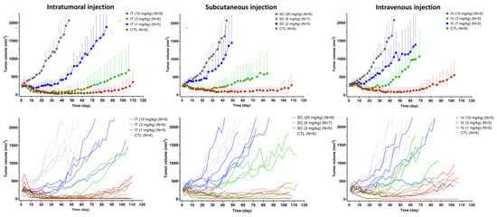 2.5. Efficacy Study of T-vc-MMAE Administered via IT, SC, and IV Route in Tumor-Bearing Mice