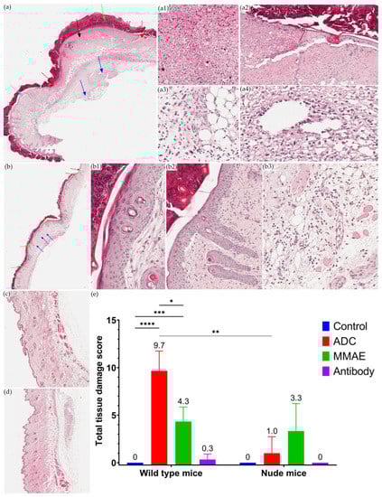 The design of the local toxicity study for SC-administered ADC is shown in Figure 1. Two mouse strains, including immunocompetent C57BL/6J WT mice (IMSR_JAX:000664, the Jackson Laboratory) and immunodeficient athymic nude mice, were used for the investigation. For each strain of mouse, a total of 12 mice were divided into four groups (N = three per group), receiving 30 mg/kg of naked mAb (Herceptin®) at a single dose, 0.5 mg/kg of naked MMAE at a single dose, 30 mg/kg of T-vc-MMAE at a single dose, or vehicle control (DPBS), subcutaneously. The SC injection volume was 100 µL for each mouse. After 96 h of SC dosing, all animals were euthanized, and the full-thickness skin tissue surrounding the SC injection site was excised. The skin tissues underwent fixation and paraffin processing by sectioning at 10 µm and staining with hematoxylin and eosin for histopathology analysis.