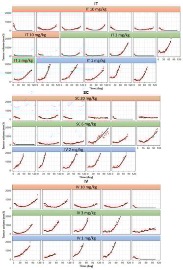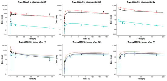 The PK/PD model development process for T-vc-MMAE administered via SC, IV, and IT routes included five steps. In step 1, our previously reported plasma PK data for naked mAb in nude mice [] was used to estimate the PK parameters of the mAb component of T-vc-MMAE, by fitting a two-compartmental model to the data. In step 2, previously reported plasma PK data of naked MMAE in nude mice [] were used to estimate the PK parameters of unconjugated MMAE in plasma. It was assumed that unconjugated MMAE behaves similarly to the naked MMAE administrated in the free form. PK parameters estimated in steps 1 and 2 were then fixed in the following steps. In step 3, parameters for the tumor disposition model obtained from various literature (Table 1) were incorporated and fixed in the semi-mechanistic PK model of T-vc-MMAE. Plasma and tumor concentration–time data for T-vc-MMAE obtained from IV administration were used to estimate , , and parameters; data for IT injection were used to estimate ; and data for SC administration were used to estimate and . In step 4, tumor growth data from untreated mice were used to estimate the rate of exponential () and linear () tumor growth (interindividual variability assigned to ), which were then fixed for the subsequent PD model development. In step 5, the PK model established in steps 1–4 was used to predict %TE inside tumor cells, which served as the driving force for ADC cytotoxicity in the PD model. Tumor growth inhibition data from all dose levels of the three routes were used to estimate parameters for the nonlinear killing function () and , where the population variability was assigned to and . Since the confidence in the measurement of smaller tumor volumes (i.e., <50 mm3) by the caliper is low, tumor volumes <50 mm3 were treated as interval-censored data for the modeling.