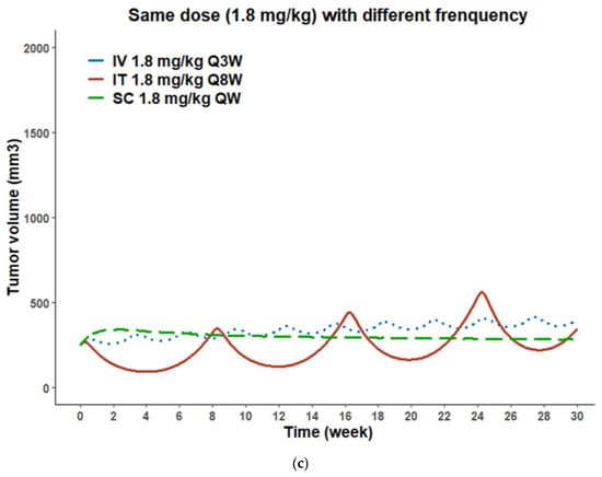 The semi-mechanistic PK/PD model for T-vc-MMAE was used to objectively evaluate the therapeutic potentials of T-vc-MMAE administrated via SC, IT, and IV routes through simulations of tumor growth inhibition (TGI) profiles in various scenarios. First, we simulated TGI using clinically approved dosing regimens of MMAE-based ADCs (i.e., 1.8 mg/kg every three weeks, Q3W) when treated via IV, SC, or IT routes for six cycles. Then, we examined what dose levels are required for IT and SC routes to achieve comparable TGI as IV injection when keeping the dosing frequency the same (Q3W). We also explored what dosing frequencies were needed for IT and SC routes to attain similar TGI as IV routes when treating with the same dose amounts (i.e., 1.8 mg/kg).