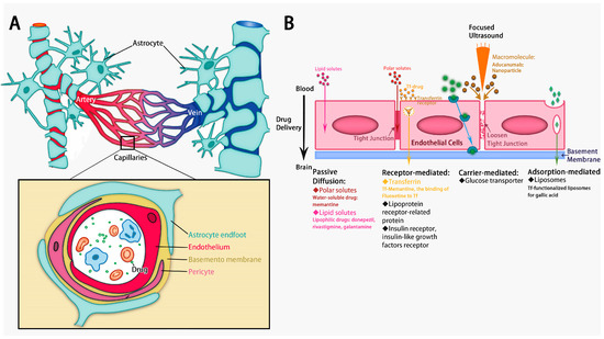 (A) The structure of the blood–brain barrier. (B) Alzheimer’s drug delivery to the BBB (Several ways to increase the AD drug delivery cross BBB. Focused ultrasound increases delivery of aducanumab [9]. Transferrin (Tf) increases delivery of memantine [10] and fluoxetine [11]. Tf-functionalized liposomes increase brain delivery of gallic acid [12]).