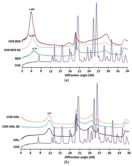 X-ray powder diffractograms (XRPD) of nanohybrids and pristine components are plotted in Figure 2a,b for BEN- and HAL-based materials, respectively. CHX exhibits a crystalline pattern with main peaks at about 8.5°, 12.7°, 13.4°, 15.9°, 20.9°, 23.7°, 26.6° and 34.4° 2θ, which are consistent with those found in the literature [29,30]. BEN shows the d001 basal reflection peak at 6.7° 2θ, approximately. According to Bragg’s law, this value gives an interlayer spacing of 13.15 Å, which is ascribable to a smectite saturated with a mixture of monovalent–divalent exchangeable cations [31]. For both bentonite-based nanohybrids, d001 basal reflection shifts to lower 2θ values (around 5.88 2θ and 6.22 2θ, for CHX–BEN and CHX–BEN SD (spray dried), respectively) in comparison with the pristine clay mineral. These results indicate that d001 basal spacing has been expanded to ≅15 Å (CHX–BEN) and ≅14 Å (CHX–BEN SD), suggesting that both methods of preparation were able to produce the effective intercalation of CHX molecules into the clay mineral structure. HAL shows d001-basal reflection at 12° 2θ (Figure 2b), corresponding to a basal spacing of 7 Å which is typical of the dehydrated form of the clay mineral [18]. No expansion in basal spacing has been observed in the nanohybrids (CHX–HAL and CHX–HAL SD). These results are coherent with the non-swelling nature of this clay mineral. Therefore, the presence of the drug in the hybrids needs to be confirmed by further characterization.