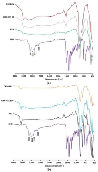 FTIR spectra of nanohybrids and pristine components: (a) BEN-–based nanohybrids; (b) HAL-–based nanohybrids. CHX: chlorhexidine dihydrochloride; BEN: bentonite; HAL: halloysite; CHX–BEN and CHX–HAL: nanohybrids obtained by intercalation solution technique; CHX–BEN SD and CHX–HAL SD: nanohybrids obtained by spray-drying technique.
