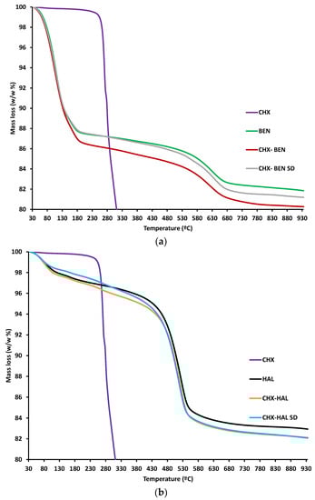 TGA curves of nanohybrids and pristine components: (a) BEN-based nanohybrids; (b) HAL-based nanohybrids. CHX: chlorhexidine dihydrochloride; BEN: bentonite; HAL: halloysite; CHX–BEN and CHX–HAL: nanohybrids obtained by intercalation solution technique; CHX–BEN SD and CHX–HAL SD: nanohybrids obtained by spray-drying technique.