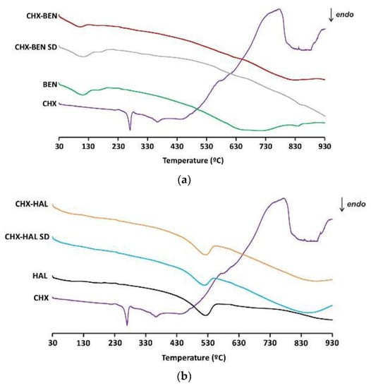 DSC curves of nanohybrids and pristine components: (a) BEN-based nanohybrids; (b) HAL-based nanohybrids. CHX: chlorhexidine dihydrochloride; BEN: bentonite; HAL: halloysite; CHX–BEN and CHX–HAL: nanohybrids obtained by intercalation solution technique; CHX–BEN SD and CHX–HAL SD: nanohybrids obtained by spray-drying technique.