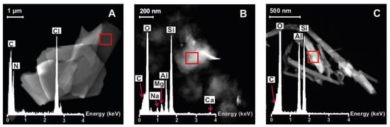 Figure 6 shows microphotographs and EDX spectra of pristine components. Results of complete UHR-TEM characterization of nanohybrids and SD nanohybrids are given in Figure 7 and Figure 8, respectively. A microphotograph of CHX (Figure 6A) shows aggregates of irregular quadrangular particles. The EDX spectrum, performed in the marked zone (red square), reveals the presence of N and Cl as characteristic elements of this drug molecule. BEN (Figure 6B) shows the typical morphology of montmorillonite, consisting of lamellar aggregates. The EDX analysis confirms that it is an aluminum–magnesium silicate with Na and Ca as main exchangeable cations, as observed by XRPD. CHX–BEN (Figure 7A) exhibits a general morphology similar to that of the clay mineral. The presence of the drug is confirmed by means of the EDX analysis. The elemental composition, performed in three different areas, evidences the characteristic components of BEN (Si, O, Al, Mg, Na and Ca) and those of the organic molecule with N and Cl as main CHX indicators.