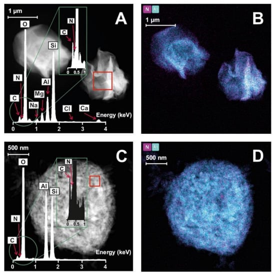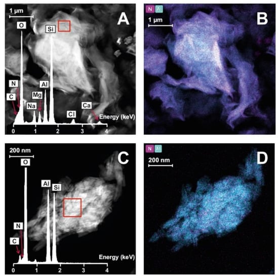 As can be expected from the SD preparation technique, both SD nanohybrids appear as spheroidal aggregates, in which layered (Figure 8A) or tubular (Figure 8C) particles can be recognized, depending on the clay component. Both samples also reveal a uniform distribution of the drug in the clayey structures (Figure 8B,D for CHX–BEN SD and CHX–HAL SD, respectively).