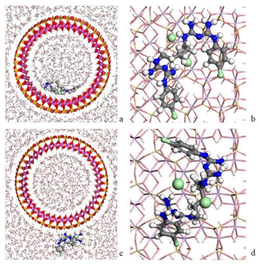 In the adsorption complex with the drug adsorbed on the internal surface of the HAL (Figure 10a,b), the CHX is positioned with an orientation parallel to the inner surface of the nanotube. The aromatic rings are mainly parallel to the surface. Hydrogen bonds between the CHX and HAL were found between the N atoms of the drug and the hydrogen atoms of the internal surface of the HAL with d (N…HOAl) around 1.9 Å. In addition, the chlorine anions have interactions with the amino H atoms of the CHX with d (NH2…Cl) around 1.9 Å. At the same distance, these ions also interact with the hydrogens of the water. On the other hand, when the drug is adsorbed on the external surface of the HAL (Figure 10c,d), the hydrogens of the amino groups of the drug were interacting with the oxygens of the external surface of the HAL with d (NH2…OSi) around 2.5 Å. In the same way as in the previous system, the chlorine anions had interactions at 1.9 Å with the amino H atoms of the drug and with the hydrogen atoms of the water.