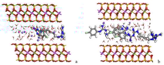 The adsorption of the drug in the interlayer space of the BEN was studied. For that, the optimized CHX, the water and the sodium cations were placed in the interlayer space of the clay using the Monte Carlo method. Subsequently, we carried out the geometry optimization of this structure followed by an NPT molecular dynamic simulation to equilibrate the model using INTERFACE. Figure 11 shows the resultant adsorption complexes.