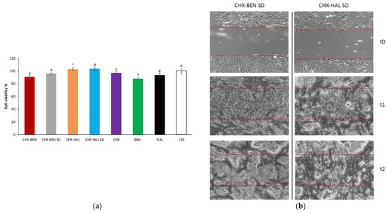 Results of the cytotoxicity test are reported in Figure 12a as the percentage of living cells after contact with the samples for 24 h. As can be observed, all the samples have a good biocompatibility with NHDF cells, as the values of cell viability percentage exceeded 80%. In particular, the CHX–HAL and CHX–HAL SD samples proved to be statistically different from the references HAL and CHX and, moreover, no statistical difference was observed when such samples were compared with CM. As for CHX–BEN SD higher cell viability percentage values with respect to BEN were observed and, furthermore, it displayed no statistical difference with CM. Indeed, no statistical difference was observed in the case of nanohybrid CHX–BEN compared to the pristine components, and lower values of cell viability % were observed in comparison with CM. Based on the biocompatibility assay, SD samples were selected for cell migration test. The better performance of HAL-based spray-dried nanohybrids was observed also during cell migration test, as can be observed in Figure 12b. In fact, CHX–HAL SD was able to promote cell migration/proliferation in the gap during the 72 h test and, in particular, a complete gap closure was observed. Therefore, this nanohybrid showed effective capability of in vitro wound healing promotion. However, the BEN-based nanohybrid was not able to promote cell migration from the side towards the cell-free zone (Figure 12b).