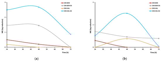 ME effect of nanohybrids against Staphylococcus aureus (a) and Pseudomonas aeruginosa (b). CHX: chlorhexidine dihydrochloride; BEN: bentonite; HAL: halloysite; CHX–BEN and CHX–HAL: nanohybrids obtained by intercalation solution technique; CHX–BEN SD and CHX–HAL SD: nanohybrids obtained by spray-drying technique.