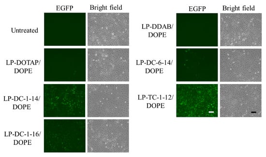 Next, we examined EGFP expression in HeLa cells 24 h after transfection with EGFP mRNA lipoplexes. The LP-DC-1-14/DOPE, LP-DC-1-16/DOPE, and LP-TC-1-12/DOPE lipoplexes exhibited high EGFP expression in HeLa cells (Figure 3), which was consistent with the luciferase expression results (Figure 2).
