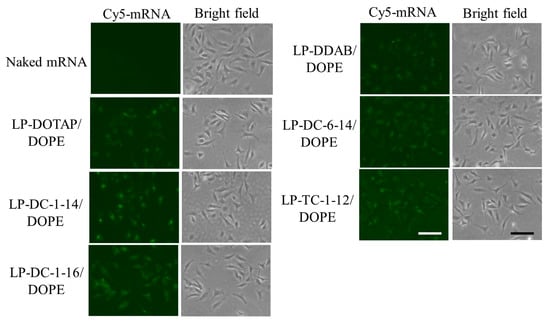 Effect of cationic lipids in mRNA lipoplexes on cellular uptake in HeLa cells after transfection with Cy5-mRNA lipoplexes. mRNA lipoplexes with Cy5-mRNA were added to HeLa cells at 0.5 μg/mL mRNA, and localization of Cy5-mRNA (green) was observed 3 h after incubation. Scale bar = 100 μm.