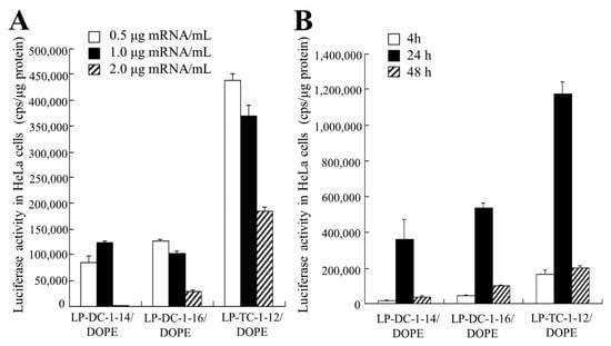 We examined the effects of incubation time and mRNA concentration on protein expression in HeLa cells after transfection of LP-DC-1-14/DOPE, LP-DC-1-16/DOPE, and LP-TC-1-12/DOPE lipoplexes with FLuc mRNA. As a result, the highest luciferase activity by transfection with FLuc mRNA lipoplexes was observed at 0.5–1.0 mg/mL mRNA (Figure 5A) and after 24 h of transfection (Figure 5B).