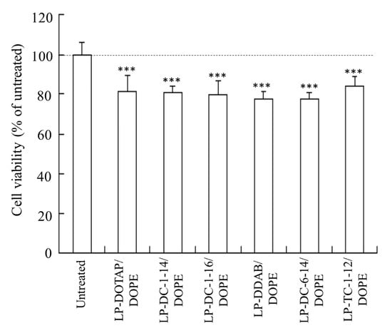 Effect of cationic lipids in mRNA lipoplexes on cell viability 24 h after transfection of FLuc mRNA lipoplexes into HeLa cells. FLuc mRNA lipoplexes were added to HeLa cells at 0.5 μg/mL mRNA. Each column represents the mean + S.D. (n = 6). *** p < 0.001, compared to untreated cells.