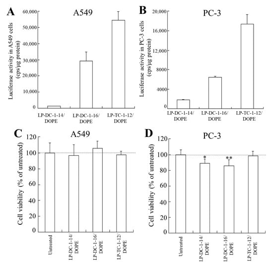 To examine the effect of the transfection activity of the mRNA lipoplexes in other cell lines, we transfected LP-DC-1-14/DOPE, LP-DC-1-16/DOPE, and LP-TC-1-12/DOPE lipoplexes into A549 and PC-3 cells. Among them, LP-DC-1-16/DOPE and LP-TC-1-12/DOPE lipoplexes exhibited high luciferase activity in both cell lines (Figure 7A,B), with no cytotoxicity in A549 cells (Figure 7C), while LP-DC-1-14/DOPE and LP-DC-1-16/DOPE lipoplexes showed slight cytotoxicity in PC-3 cells (89% and 86%, respectively) (Figure 7D). Altogether, the LP-DC-1-16/DOPE and LP-TC-1-12/DOPE lipoplexes induced high protein expression, regardless of the cell line into which they were transfected.