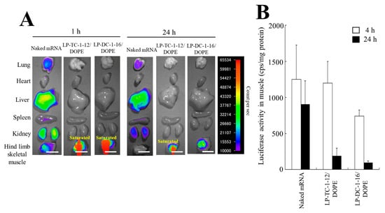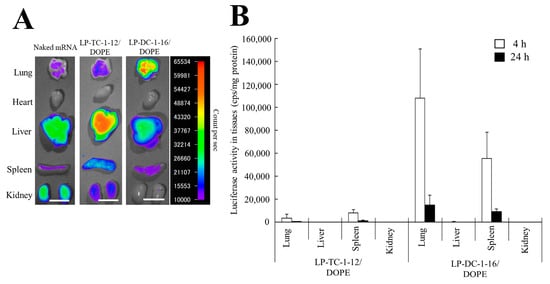 Furthermore, we analyzed luciferase expression in the homogenates of major organs after IV injection of mRNA lipoplexes. When LP-DC-1-16/DOPE lipoplexes with FLuc mRNA were systemically injected into mice, they exhibited high luciferase activity in the lungs and spleen, with maximum expression observed at 4 h post-administration (Figure 9B). In contrast, IV injection of LP-TC-1-12/DOPE lipoplexes resulted in lower luciferase activity than that of LP-DC-1-16/DOPE lipoplexes in the lungs and spleen. However, luciferase expression levels in the liver and kidney after IV injection of LP-DC-1-16/DOPE or LP-TC-1-12/DOPE lipoplexes were at the background level.