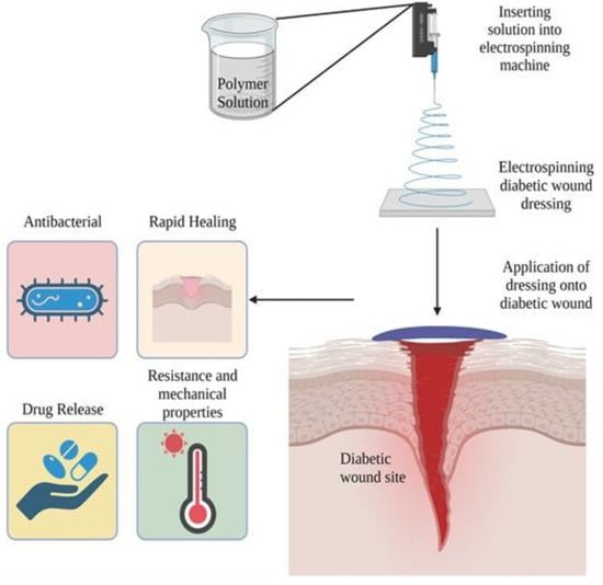 - Liu, Y.; Li, C.; Feng, Z.; Han, B.; Yu, D.-G.; Wang, K. Advances in the Preparation of Nanofiber Dressings by Electrospinning for Promoting Diabetic Wound Healing. Biomolecules 2022, 12, 1727. [Google Scholar] [CrossRef] [PubMed]