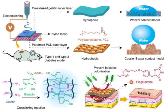 The organization of fibers or scaffolds remains an area of research, as their orientation has been shown to play a role in the effectiveness of diabetic wound treatments. In a study by Sun et al., nanofibrous scaffolds of PCL/Col1 with basketweave-like patterns mimicked the natural Col arrangement. Compared with aligned or randomly oriented nanofibrous scaffolds, the basketweave patterns showed the greatest improvements and enhancements in their ability to heal wounds in diabetic rats. The patterns also accelerated fibroblast migration and promoted angiogenesis, and the inflammation levels noticeably decreased [63]. The use of asymmetric wettable dressings to treat diabetic wounds is another promising approach. An asymmetric wettable dressing developed by Yu et al. using PCL by electrospinning pioglitazone-incorporated gelatin (Gel-pio) to form a hydrophobic outer layer while creating a hydrophilic layer on the inside. The outer layer acted as a water barrier for the wound area to remain dehydrated, whereas the inner layer protected against bacterial growth or infection. The in vitro results showed that gelatin (GEL) nanofibers incorporated with a pioglitazone accelerated cell proliferation and migration. In vivo, the composite dressings enhanced diabetic wound healing by enhancing cell proliferation and angiogenesis, while modulating the expression of VEGF, MIP-2, IL-1β, IL-6, TNF-α, MMP-9, and TGF-β (Figure 3) [44].