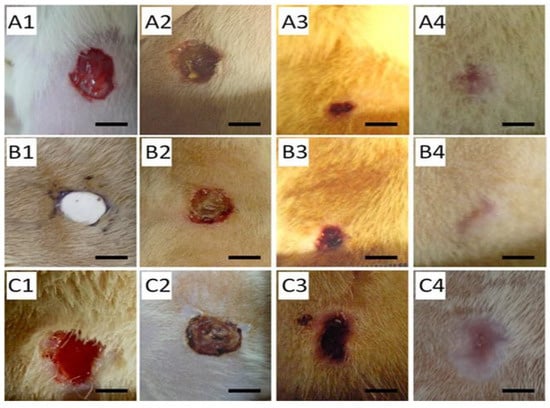 Wound healing on day 0 (1), 3 (2), 7 (3), and 14 (4) post treatment: (A) the PLGA with metformin group; (B) virgin PLGA; (C) the conventional gauze sponge group. Scale bar = 5 mm. Reproduced with permission from Ref. [66]. Copyright 2014, American Chemical Society.