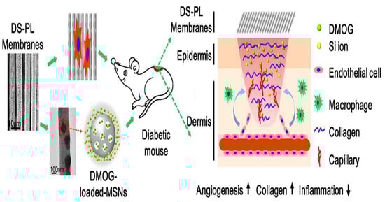 Graphical representation of electrospun membranes containing DMOG-loaded mesoporous silica nanoparticles (DS) for diabetic wound healing. Reproduced with permission from Ref. [49]. Copyright 2014, Elsevier.