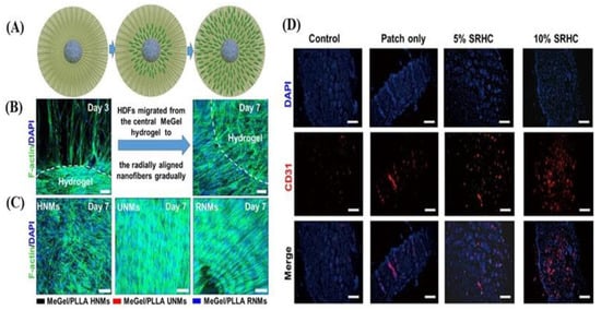The orientation of the electrospun nanofibers significantly affected their mechanical properties. Wu et al. designed electrospun methacrylated gelatine (MeGel)/PLLA radially oriented nanofiber mats (RNMs) as dressing patches. Dressing patches, in combination with Salvia miltiorrhiza Bunge-Radix puerariae (SRHC), a herbal compound, showed improvements in the closure and healing of diabetic wounds, as they promoted the proliferation and migration of human dermal fibroblasts (HDFs) compared to simple medical gauzes. When loaded with SRHC, the dressings exhibited excellent hemostatic performance, and they presented antibacterial properties against Escherichia.coli and S. aureus. Furthermore, the 10% SRHC-loaded dressing reduced inflammation and promoted vascularization and regeneration of hair follicles (Figure 6) [50].