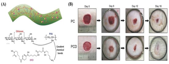 Hydrogel electrospun fibers’ structure and the covalent chemical bonds among CS, PVA, and DFO drug (A), photographs of the wound healing at days 0, 6, 12, and 18 post-treatment (B). Reproduced with permission from Ref. [54]. Copyright 2016, Wiley.