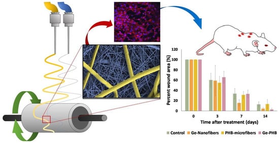 Graphical representation of PHB and Ge nanofibers as wound dressings. Reproduced with permission from Ref. [90]. Copyright 2021, Elsevier.