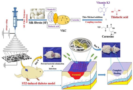- Kandhasamy, S.; Liang, B.; Yang, D.P.; Zeng, Y. Antibacterial Vitamin K3 Carnosine Peptide-Laden Silk Fibroin Electrospun Fibers for Improvement of Skin Wound Healing in Diabetic Rats. ACS Appl. Bio Mater. 2021, 4, 4769–4788. [Google Scholar] [CrossRef]