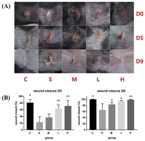 (A) Wound images at 0, 5, and 9 days (D0, D5, and D9). H Diabetic, 5% sesamol-CA/Zein composite nanofiber membrane; S Diabetic, no intervention; M Diabetic, CA/Zein blended nanofiber membrane; L Diabetic, 2% sesamol-CA/Zein composite nanofiber membrane; and C Normal. (B) Quantitative analysis of wound closure in diabetic mice at day 5 (D5) and day 9 (D9). * Statistically significant, p < 0.05 vs. group C, # Statistically significant, p < 0.05 vs. group S. Reproduced with permission from Ref. [93]. Copyright 2020, Elsevier.
