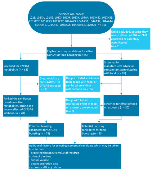 The selection of potential boosting candidates was based on ATC code, as derived from the WHO ATC/DDD index [13]. Drugs with ATC code L01E, L01XK, L01XG, L01XJ, L01XK, L01XX, L04AA, L01XX52, L01XX59, L01XX62, L01XX73, L01XX77, L04AA29, L04AA32, L04AA37, L04AA44, L04AA46, L04AA49, L04AA56, L04AA59 and D11AH08 were selected to be profiled for pharmacokinetic boosting. This selection contains tyrosine kinase inhibitors, other kinase inhibitors and other oral targeted inhibitor drugs, which will collectively be described as kinase inhibitors for simplicity and recognizability. Parenterally administered drugs and drugs without FDA or EMA approval were excluded, resulting in 85 drugs to be profiled for either CYP3A4 boosting or food boosting. A QuickScan algorithm was used, followed by criteria score-based ranking (Figure 1 and Table 1). Relevant drug characteristics used for selecting candidates and the information in Table 2, Table 3 and Table 4 were retrieved from the Summary of Product Characteristics (SmPC), European Public Assessment Reports (EPAR) and UpToDate [14,15]. The known inhibitory effects of CYP3A4 inhibitors on the potential boosting candidate were retrieved from UpToDate interaction checker by entering the potential boosting candidate in combination with cobicistat [16]. To identify the kinase inhibitors used in the treatment of malignancies and auto-immune disease which are the most eligible candidates for pharmacokinetic boosting, we employed a systematic approach using predefined criteria. For CYP3A4 boosting, the target drug needed to be a substrate for CYP3A4, excluding seven drugs. The remaining 78 drugs were systematically ranked based on criteria which are important for selecting potential boosting candidates. In the case where the boosting candidate forms active metabolites that contribute significantly to the pharmacological effect, the exposure of the active metabolites can be decreased by CYP3A4 boosting, making CYP3A4 boosting less rational. We defined three scores for the active metabolites criterium: 0—no active metabolites or unknown; 1—active metabolites with minor (<10%) contribution to effect; 2—active metabolites with major (>10%) contribution to effect. The second ranking criterium for selecting potential CYP3A4 boosting candidates is the already known effect of strong CYP3A4 inhibitors on the exposure of boosting candidates. This information is derived from drug–drug interaction studies. We defined four scores for the increase in exposure criterium: 0—>200% increase in AUC; 1—100–200% increase in AUC; 2—50–100 % increase in AUC; 5—<50% increase in AUC or unknown. Drugs with mg-based pricing or those for which only one strength of the drug is available are scored 0. Drugs with flat-based pricing for all available strengths are scored 1. As an exception to the aforementioned pricing scores, sonidegib was scored 1 because no dose reduction is possible with the one available strength of sonidegib. The therapeutic value of a drug was not taken into account; it was assumed that all kinase inhibitors have an equivalent therapeutic value.