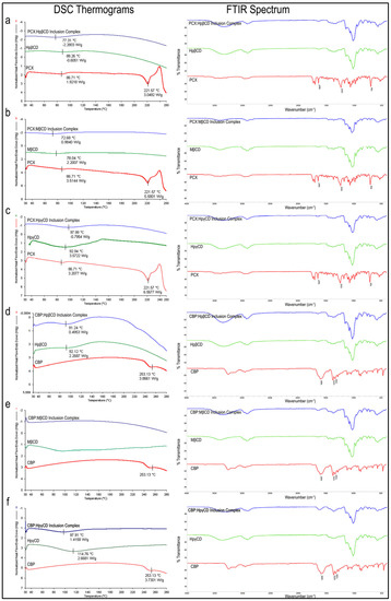 DSC thermograms and FTIR spectra of (a) PCX:HpβCD, (b) PCX:MβCD, (c) PCX:HpγCD, (d) CBP:HpβCD, (e) CBP:MβCD and (f) CBP:HpγCD inclusion complexes.