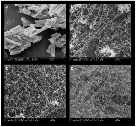 When free PCX is examined under SEM, the characteristic sharp rods of PCX crystals are seen (Figure 2a) [24,25]. PCX:CD inclusion complexes were visualized with SEM to show that inclusion complexes are formed and that there is no free PCX. As seen in Figure 2b–d, PCX crystals were not seen in the inclusion complexes, although field scanning was performed. This is another indication that inclusion complexes are successfully formed and the free crystalline drug is not present.