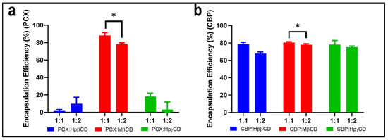 Encapsulation efficiency (%) of (a) PCX:CD (b) CBP:CD inclusion complexes (* the difference is significant, p < 0.05 (Student’s t-test), n = 3).