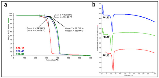 Thermograms of PCL10, PCL45 and PCL80 are given in Figure 4a obtained at the end of the thermogravimetric analyses by TGA. There is a single degradation peak in all PCL derivatives. It has been observed that PCL’s molecular weight and thermal resistance increase in direct proportion. PCL10 begins to degrade at 309 °C, while PCL45 at 332 °C and PCL80 at 336 °C. All PCL derivatives are completely degraded at 700 °C and the remaining ash is nearly zero. In line with the literature, the thermal resistance of PCL10 was found to be lower than that of the other PCL derivatives [42]. It was also observed that the difference between PCL45 and PCL80 was quite low. This is expected because the length of the molecular chain increases thermal resistance up to a certain point, but the effect on thermal resistance above a certain molecular weight remains limited like all physical properties except melt viscosity [43]. In the scope of these results, it can be said that PCL80 shows a higher thermal resistance than other PCL derivatives.