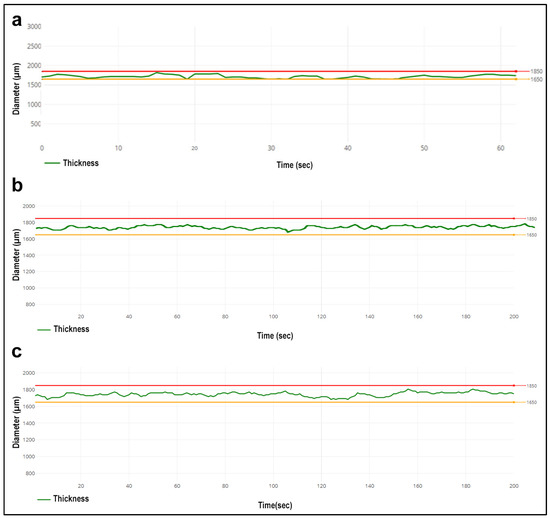 Time-dependent change of filament thickness during production (a) Drug-free PCL filament, (b) PCL filament containing PCX:CD inclusion complex, (c) PCL filament containing CBP:CD inclusion complex.