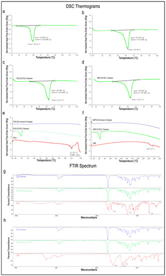 DSC thermogram of (a) PCL pellet, (b) Blank PCL Filament, (c–e) PCX:CD PCL Filament, (d–f) CBP:CD PCL Filament, and FTIR spectrums of (g) PCX:CD PCL Filament and (h) CBP:CD PCL Filament.