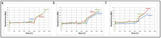Stress/Strain graph of (a) Blank PCL Filament, (b) PCX:CD PCL Filament, (c) CBP:CD PCL Filament (n = 3, sample 1 (blue), sample 2 (red), sample 3 (green)).