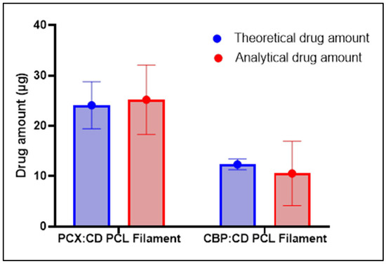 One centimeter samples were taken from each filament and weighed with a precision balance to calculate the theoretical amount of drug in each filament. In calculating this value, the ratio of the quantities of drugs and polymers used during preparation is considered. Accordingly, 1‰ of the total weight of the filament was calculated as PCX and 0.5‰ as CBP. In the calculation of analytical drug amounts, 1 cm samples were dissolved in a suitable solvent and drug amount were measured by the validated HPLC method. The theoretical and analytical drug amount for each drug is given comparatively in Figure 8. When these results are compared, it is seen that the filaments contain more than 85% of the drugs for both PCX and CBP. Thus, it was shown that the stability for each drug was maintained and loaded into the filaments at a high rate.