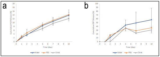 CBP:CD filaments showed a faster release profile, unlike PCX:CD filaments (Figure 9b). In all three release media, CBP release was not observed during the first 24-hour period, followed by a controlled release for 10 days. The highest rate of release was seen in filaments in ultra-pure water. The solubility of CBP in water (≅40 mmol/L) [51] is quite high in contrast to PCX. The high solubility in the water is seen as one of the reasons why the release in the aquatic environment is faster. In addition, unlike PCX, the release of CBP was observed to occur independently of the degradation of PCL. CBP:CD inclusion complex are thought to concentrate on the surface of the filament and become free with the effect of the release medium.