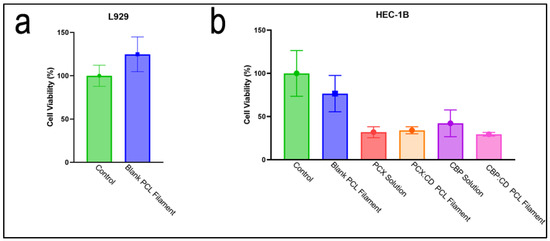The cytotoxic effect of blank PCL filaments was examined in the L929 mouse fibroblast cell line to show that drug-free filaments do not have any toxic effects on healthy cells. As a result of this study, it was seen that filaments did not show any statistically significant effect on cell viability compared to the control group (Figure 10a). This result is an indication that drug-free filaments are safe and do not have any toxic effects on healthy cells.