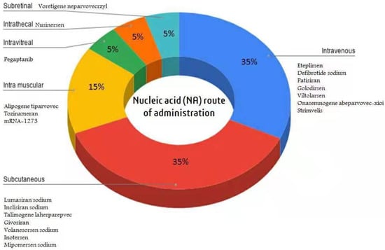 In addition to the drug delivery approach, the selection of suitable administration routes is also a significant factor in ensuring efficient and safe drug delivery. Primarily, NA therapeutics are designed for parenteral administration because they are often hard to administer via non-parenteral routes [142]. Therefore, NAs must be formulated as a stable liquid or freeze-dried powder to deliver these drugs safely and efficiently to their target site [143]. To target drug delivery sites, NAs need to be carefully tailored. The novel trends are set to subcutaneous (SC) administration, and the percentage of NA therapeutics approved for SC administration has risen gradually. Among the approved NA therapeutics, 35% of each have been intended for SC and IV administration (Figure 2). Recently, the approved mRNA vaccines for COVID-19 have been administered intramuscularly (IM). NA formulations with a high strength (i.e., >80 mg/mL) are more frequently delivered subcutaneously. Therefore, the NA concentrations in the formulations may depend on the therapeutic effect and the selected administration route for drug delivery. For example, nusinersen (2.4 mg/mL) was administered via the intrathecal route (IT), pegaptanib (0.4 mg/mL) via the intravitreal route (IVI), and mipomersen sodium (200 mg/mL) via the SC route.