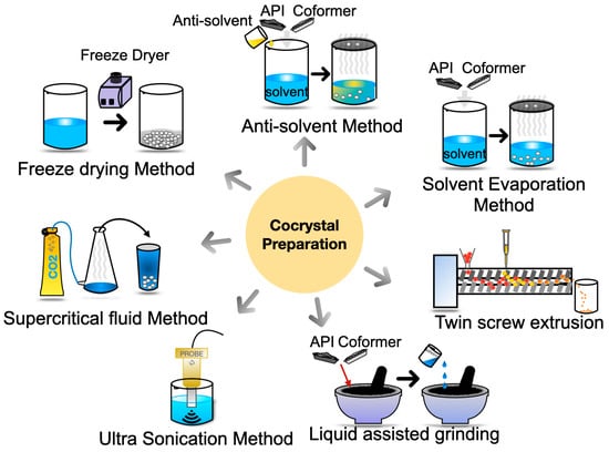 Cocrystals can be considered superior to amorphous API forms or solid dispersions because they possess the solubility advantages of high-energy solids and have a crystalline structure with good thermodynamic stability [9,10]. Cocrystals are defined by the European Medicines Agency (EMA) as “homogenous (single phase) crystalline structures made up of two or more components in a definite stoichiometric ratio where the arrangement in the crystal lattice is not based on ionic bonds (as with salts) and the components of a cocrystal may nevertheless be neutral as well as ionized” [11]. The United States Food and Drug Administration (USFDA) defines cocrystals as “Crystalline materials composed of two or more different molecules, typically API and cocrystal formers (coformers), in the same crystal lattice in a defined stoichiometric ratio.” Cocrystals are different from salts, polymorphs, solvates and hydrates [12]. The hydrogen-bonding interactions of API with the coformer alter its physicochemical properties and lead to enhanced pharmaceutical attributes [13]. Various methods [14] have been utilized till the present by researchers to prepare pharmaceutically acceptable cocrystals and have been illustrated in Figure 1.